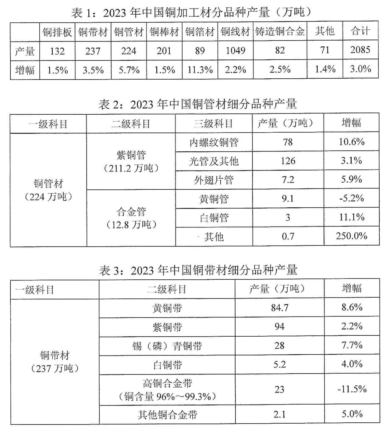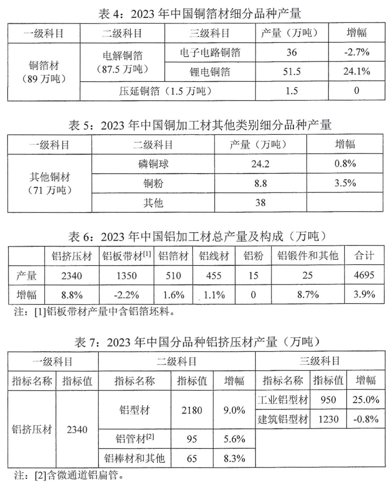 2023年,中國銅加工材綜合產(chǎn)量為2085萬噸,比上年增長3.0%。鋁加工材綜合產(chǎn)量為4695萬噸,比上年增長3.9%,其中剔除鋁箔坯料后的鋁加工材產(chǎn)量為4115萬噸,比上年增長4.2%。銅鋁加工材細(xì)分品種產(chǎn)量和鋁擠壓材表面處理方式構(gòu)成詳見下表1至表11。